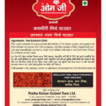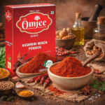JeeOmJee Kashmiri Mirch Powder. Made from carefully selected premium Kashmiri red chillies, this finely ground spice is known for its naturally vibrant red colour, mild pungency, and rich aroma.
